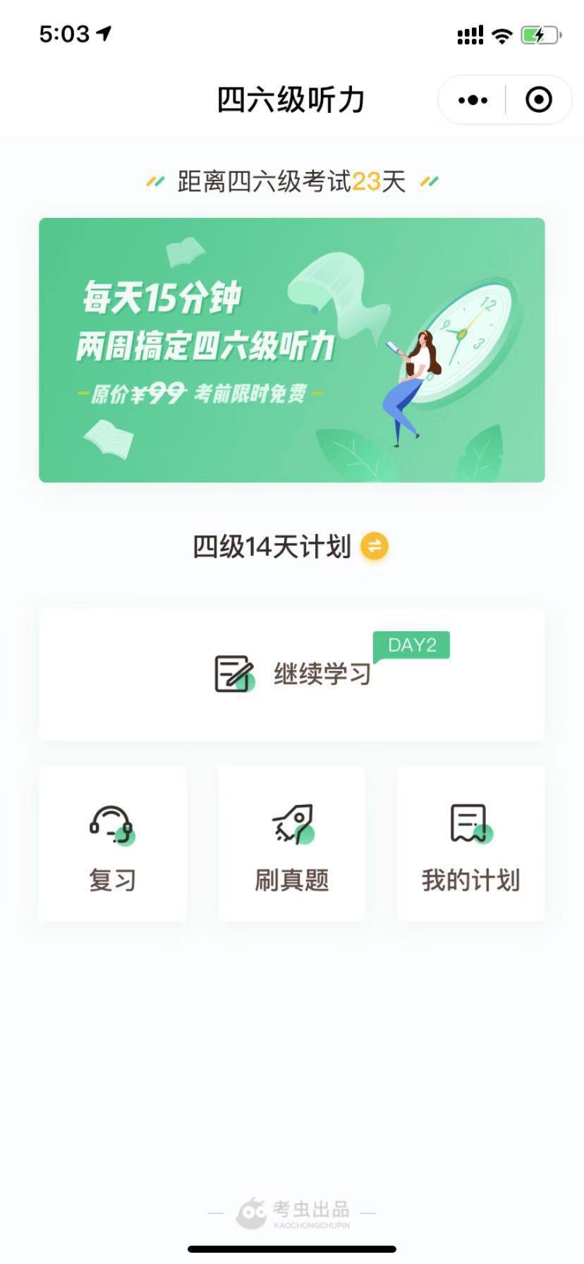 两周搞定四六级听力是考虫出品的听力小程序,适用于考前想要短期大幅度提分的同学,涵盖四六级听力中90%的考试技巧,配必练真题,每天15分钟,轻松拿下听力